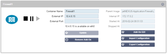 Ici, vous pouvez définir une IP externe pour accéder à votre module complémentaire. Il peut s'agir d'accéder à l'interface graphique du module complémentaire ainsi qu'au service qui fonctionne via le module complémentaire. Dans le cas du module complémentaire Firewall, il s'agit de l'adresse IP de votre service HTTP. Le pare-feu peut ensuite être configuré pour accéder à un serveur ou à un VIP ALB-X qui contient plusieurs serveurs pour l'équilibrage de charge.