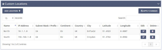 GSLB также можно настроить на использование пользовательских местоположений, чтобы использовать его во внутренних "частных" сетях. В приведенном выше сценарии GSLB определяет местоположение клиента путем перекрестного сопоставления публичного IP-адреса клиента с базой данных для определения его местоположения. Он также определяет местоположение IP-адреса службы по той же базе данных, и если политика балансировки нагрузки установлена на политику GEO, он вернет ближайший IP-адрес. Этот метод отлично работает с публичными IP-адресами, но для внутренних частных адресов, соответствующих RFC 1918 для адресов IPv4 и RFC 4193 для адресов IPv6, такой базы данных не существует.