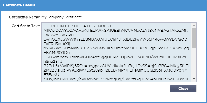·     Выберите сертификат, который вы создали в описанных выше шагах. Для элемента строки будет установлен статус (Pending). В примере MyCompanyCertificate показан на изображении выше.