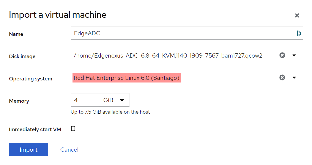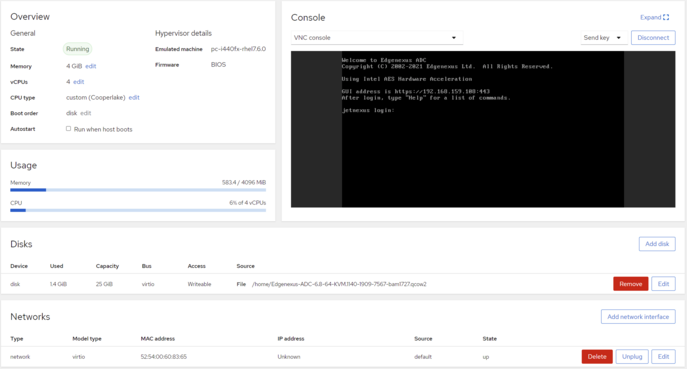 Der folgende Abschnitt zeigt, wie der EdgeADC auf einer KVM-Plattform installiert wird. Die für diese Übung verwendete KVM-Plattform lief auf einem CentOS v8-Betriebssystem mit installiertem Cockpit und Virtualisierung.