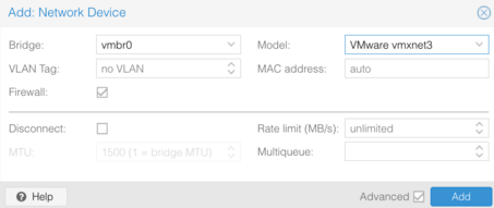 Konfigurieren Sie es wie in der Abbildung oben gezeigt. Es ist wichtig, das Modell als VMware vmxnet3 zu wählen.