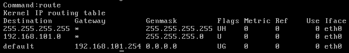 Um zu überprüfen, ob das Standardgateway hinzugefügt wurde und korrekt ist, verwenden Sie den Befehl route. Dieser Befehl zeigt die Netzwerkrouten und den Wert des Standardgateways an. Siehe das folgende Beispiel.