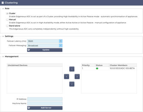 ADC можно использовать как одиночное автономное устройство, и он будет отлично работать в этом качестве. Однако если учесть, что назначение ADC - балансировать нагрузку серверов, необходимость кластеризации самого ADC становится очевидной. Удобный пользовательский интерфейс ADC делает настройку системы кластеризации простой и понятной.