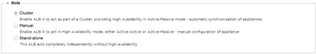 По умолчанию новый ADC включается с ролью Cluster. В этой роли каждый член кластера будет иметь одинаковую "рабочую конфигурацию", и, таким образом, только один ADC в кластере будет активен в любой момент времени.