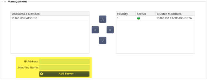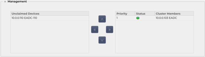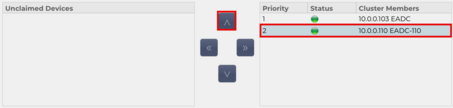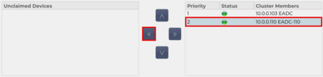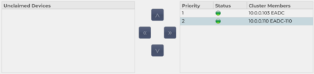 В этом разделе можно добавлять и удалять членов кластера, а также изменять приоритет ADC в кластере. Раздел состоит из двух панелей и набора клавиш со стрелками между ними. Область слева - это невостребованные устройства, а крайняя правая область - сам кластер.