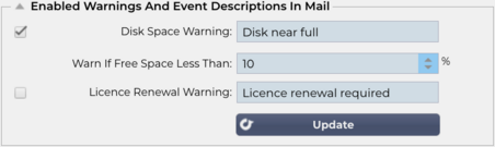 Этот параметр позволяет включить или отключить предупреждение об истечении срока действия лицензии, отправляемое по электронной почте системному администратору. При достижении этого значения вам будет отправлено электронное письмо.