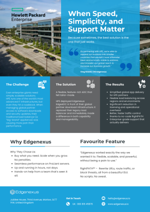 Hewlett Packard Enterprise needed to deliver software downloads and updates to a global partner ecosystem, quickly, securely, and without interruption. But their legacy load balancer was holding them back. It was complex to configure, rigid in licensing, and expensive to scale. Worse still, support was lacking, and integration with their existing HPE ProLiant infrastructure felt clunky and outdated. HPE needed a solution that could handle global traffic intelligently, reduce operational overhead, and give their teams more control, without sacrificing performance or enterprise-grade reliability.